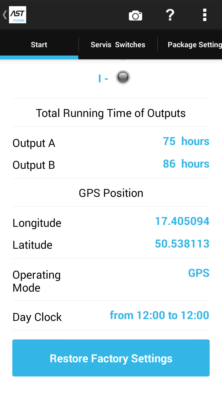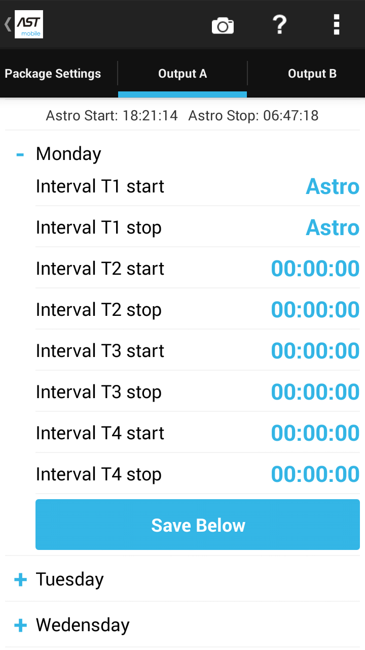 For the ASTmidifactory settings (for the 00:00 to 00:00:00 day) the switching intervals from Monday to Sunday are set identically T1,T2,T3,T4 Start : 00:00:00:00 , T1,T2,T3,T4 Stop : 00:00:00:00, which means that the outputs will be permanently disabled.