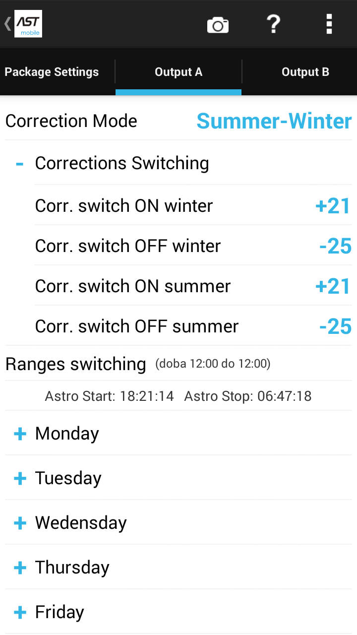 For the ASTmidi factory settings (for the 12:00 to 12:00 day) switching periods from Monday to Sunday are set identically T1 start: Astro, T1 stop: Astro, which means that every day the lighting will be switched on at sunset + switch-on correction time, and switched off at sunrise + switch-off correction time. Depending on the selected mode of operation, the switch-on/off corrections may have a different value at certain times of the year.