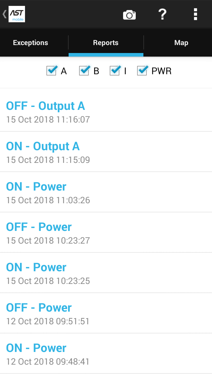 The Report screen contains a list of all recorded events. The ASTmini driver allows you to record up to 100 events, it records the following events: