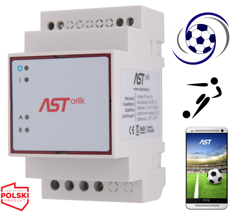 ASTorlik – Lighting controller for sports facilities. AST System once again launches the ASTorlik driver and a specially designed mobile application to control the lighting of sports fields. Thanks to the ASTorlik solution, you do not have to pay for subscriptions as it used to be, now it is enough to download the free application, and you have control over the lighting at your fingertips. The ASTorlik is housed in a 3-module wide DIN rail-mounted enclosure, with two independent outputs, a light circuit trigger input, and built-in Bluetooth. ASTorlik has a built-in GPS receiver, making lighting switching precision ideal.