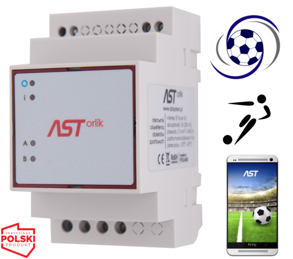 ASTorlik – Lighting controller for sports facilities. AST System once again launches the ASTorlik driver and a specially designed mobile application to control the lighting of sports fields. Thanks to the ASTorlik solution, you do not have to pay for subscriptions as it used to be, now it is enough to download the free application, and you have control over the lighting at your fingertips. The ASTorlik is housed in a 3-module wide DIN rail-mounted enclosure, with two independent outputs, a light circuit trigger input, and built-in Bluetooth. ASTorlik has a built-in GPS receiver, making lighting switching precision ideal.